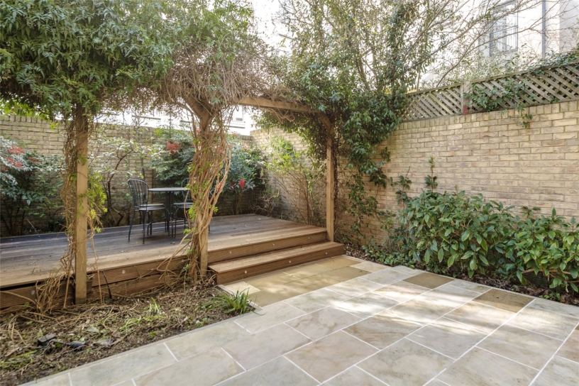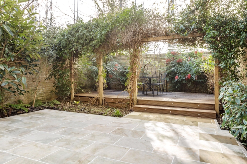 The property has been refurbished to a high specification with contemporary finishes, bespoke wardrobes, blinds, underfloor heating, and double-glazed sash windows, taking advantage of the natural light. At the front, railings enclose a paved garden with an external store and a door to a hall with access to a kitchen/dining room and a utility/cloakroom. The open plan dual aspect kitchen/dining room has glazed doors to a private rear garden which is landscaped for ease of maintenance with paved and decked seating areas. The kitchen has a comprehensive range of units with built-in appliances including a double oven, a wine fridge, and a fridge with a separate freezer. The dual aspect reception room on the first floor measures 24 ft. by over 20 ft., and has space for a secluded study area. There are two double bedrooms and a bathroom on the second floor and the principal bedroom suite, with four piece bathroom and covered balcony, occupies the whole of the third floor.