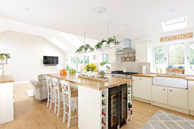 The sitting room has been extended to include a garden room with skylights and French doors to the garden and access to an under stair cupboard. The dining room has a window to the front. The kitchen/family room has bi-folding doors to the garden, along with skylights and windows to each side. There is a range of wall and floor units, with a central island and various integrated appliances, a tiled floor continues into the family area.