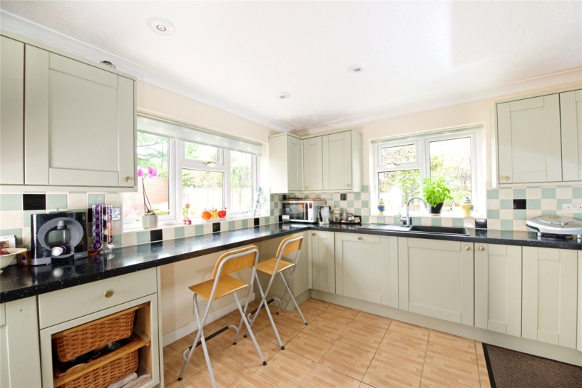 The sitting room has a brick feature fireplace. The dining room has a laminate floor and double doors to the garden. The kitchen/breakfast room has wall and floor units with 'MStone' (a stone/granite alternative) work surfaces, a breakfast bar and a tiled floor. Integrated appliances include an electric hob, double oven and a dishwasher