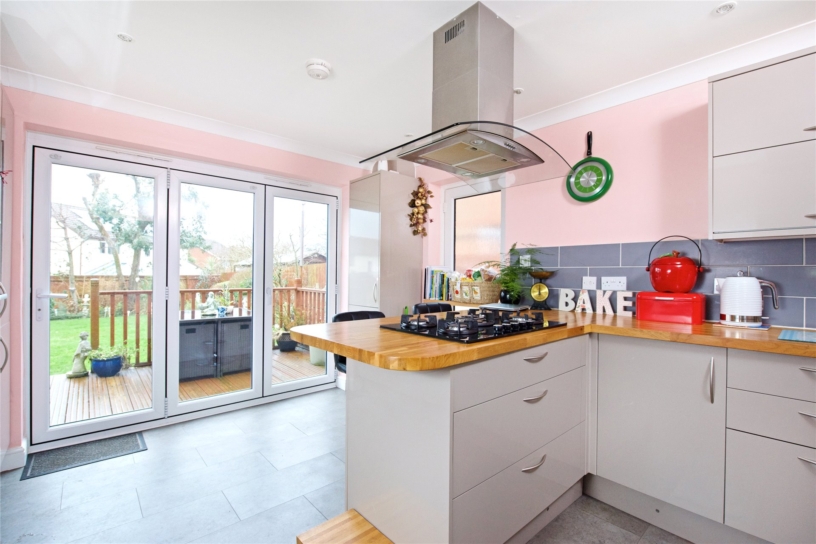 The kitchen has been refitted in a range of high gloss full height, base and wall units with woodblock worksurfaces incorporating a breakfast bar. Integrated appliances include a gas hob with canopy extractor over, a microwave and a Bosch oven. There is a tiled floor and bi-fold doors to the garden. The sitting room also has bi-fold doors to the garden, a feature fireplace and wooden flooring which extends into the hall and dining room.