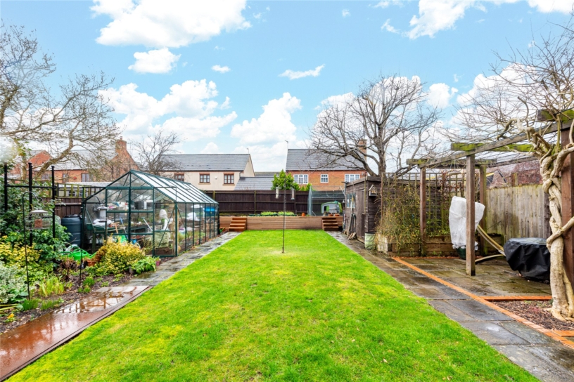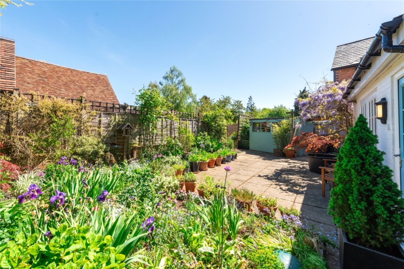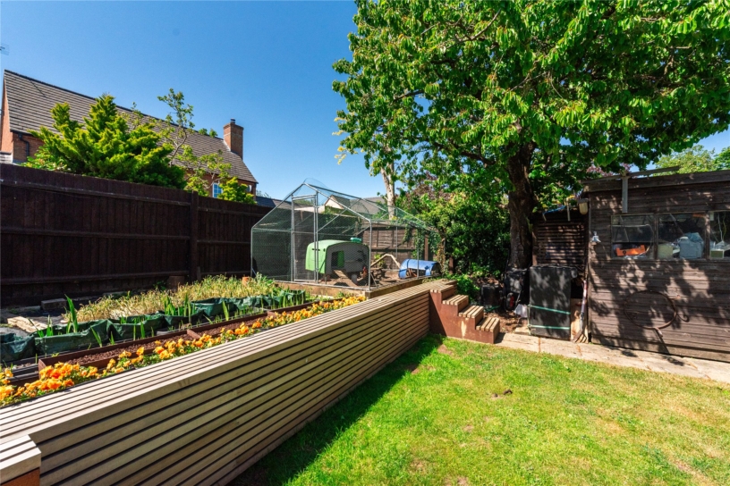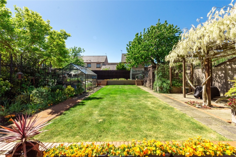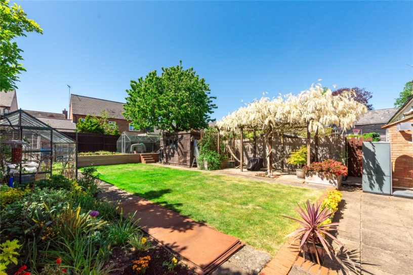 Accessed from gated side entrance at the front, and from doors in the family and sitting rooms and bedroom two, there is a patio which extends the width of the property. An area to the side is covered by a wooden pergola and a central lawn has pathways to each side with mature flower and shrub beds and borders. Towards the rear, there are steps up to a raised and planted area. The garden has fenced boundaries and a wooden shed.