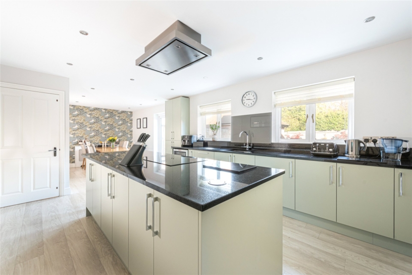 Accessed off the entrance hall, the kitchen/breakfast room has a range of contemporary fitted wall and full-height units with granite worktops and splashbacks and an inset sink with a water softener. Amtico flooring continues through to the dining area. Integrated appliances include twin electric ovens, a warming drawer, an induction hob with a ceiling mounted extractor unit over, a dishwasher, and a fridge. There are windows to the rear garden and the breakfast area has glazed double doors leading out to the paved seating area and rear garden.