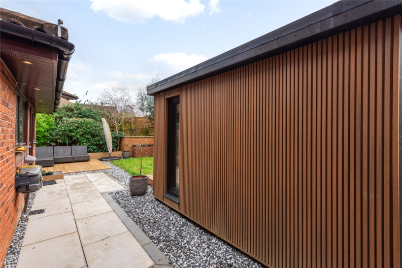 The block paved driveway at the front of the property provides parking for up to three cars and Electric Vehicle charging. The rear garden has a porcelain patio area and an area of composite decking outside the sitting room, planted rock edged borders, a built-in shed, exterior lighting and a water supply. There is a workshop/garden office which is fully insulated, has light and power connected and a raised hardwood deck in front. There is a brick retaining wall at the rear of the garden with a raised area planted with trees and shrubs.