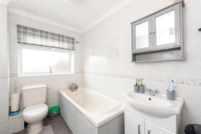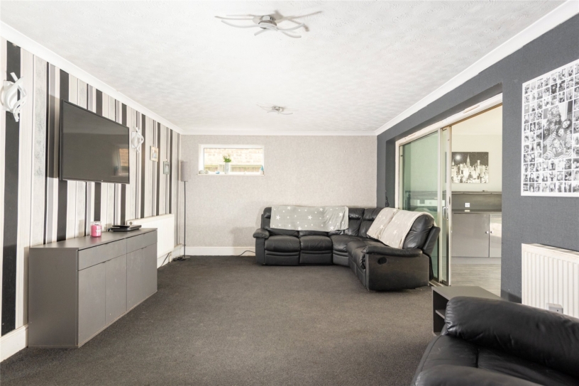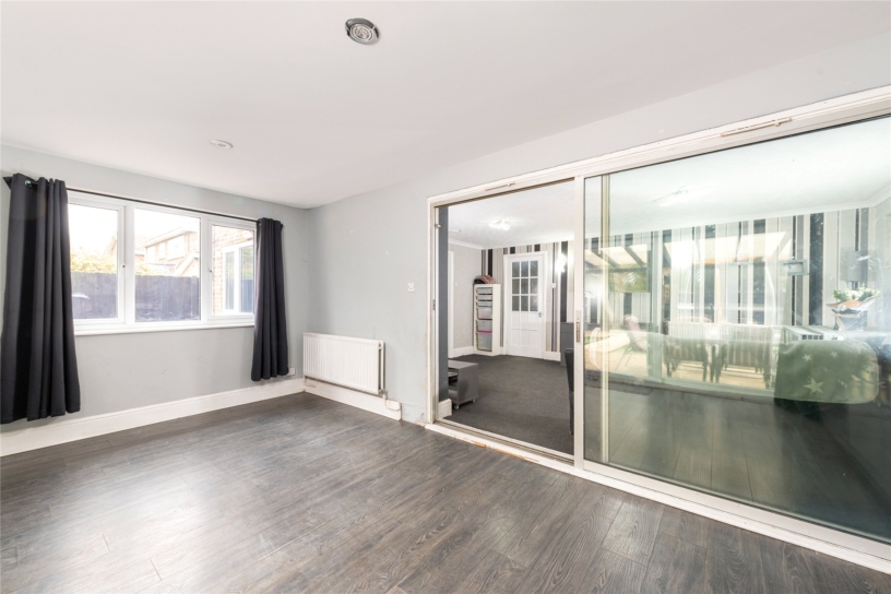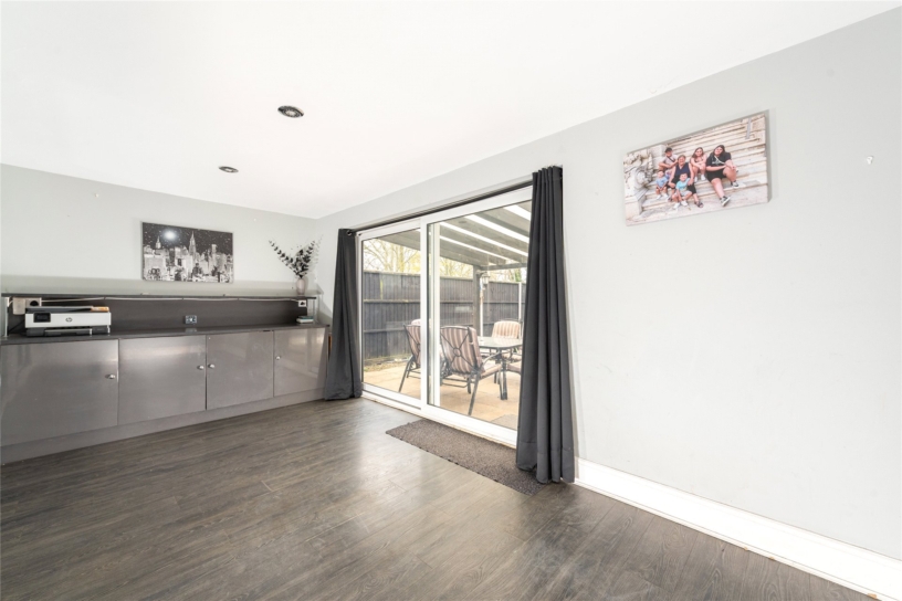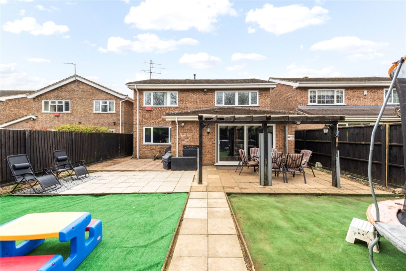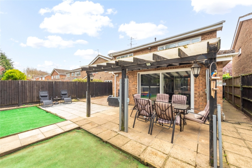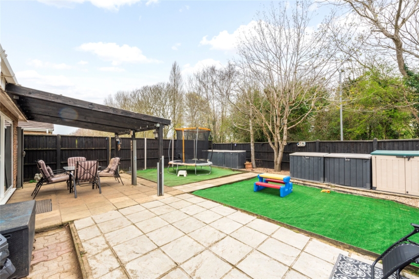The rear garden is accessed via sliding doors from the garden room onto a patio which spans the width of the property and extends round both sides. There are pathways along the edge and down the centre of the garden and the patio is partially sheltered by a wooden pergola. There are two Astroturf areas and a raised border on the rear boundary with mature shrubs. The garden is enclosed by close boarded fencing.