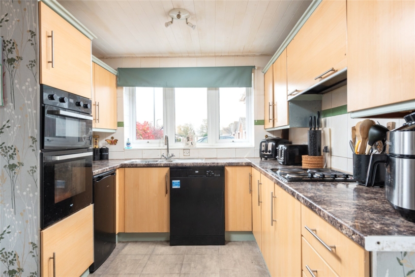 The dual aspect kitchen has a range of wall and base units, with tiled splashbacks and laminate work surfaces which incorporate a two seater breakfast bar, and a stainless steel one and a half sink and drainer. Integrated appliances include a gas hob with an extractor over and twin electric ovens, with spaces for a dishwasher, washing machine and a fridge. Laminate flooring extends into the entrance hall and dining room.