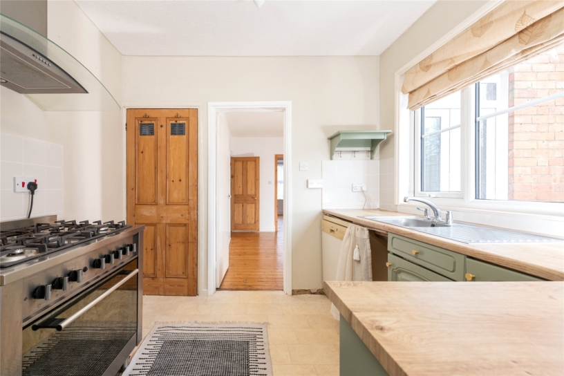 The kitchen has a range of wall and base units with wood work surfaces incorporating a stainless steel sink and drainer. There are spaces for a range style cooker, a dishwasher, and a washing machine. There is an understairs storage cupboard, and a door to the utility room.