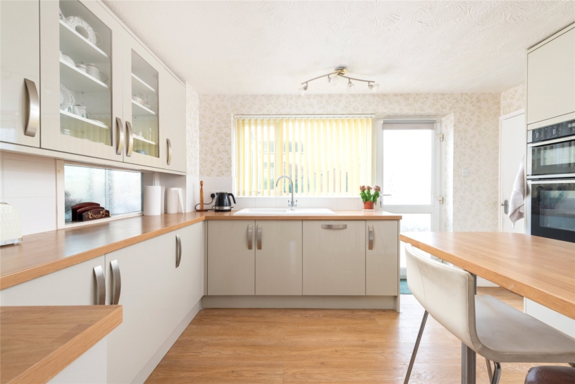 The refitted kitchen/breakfast room wood style flooring, and a range of wall and base units with wood block style work surfaces incorporating a ceramic sink and drainer with mixer tap over, and a fitted breakfast bar. Built-in appliances include an eye level double oven, an electric hob, and a dishwasher. There is a door to the rear garden and the adjoining utility room.