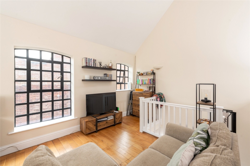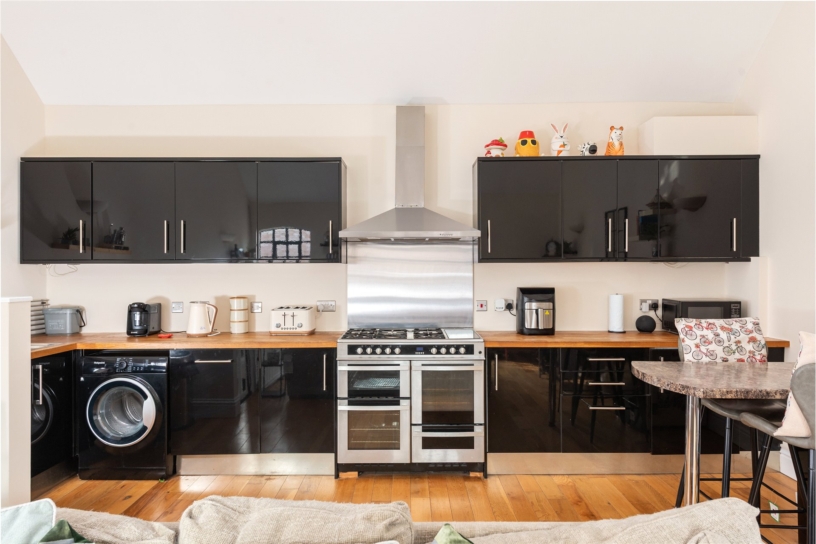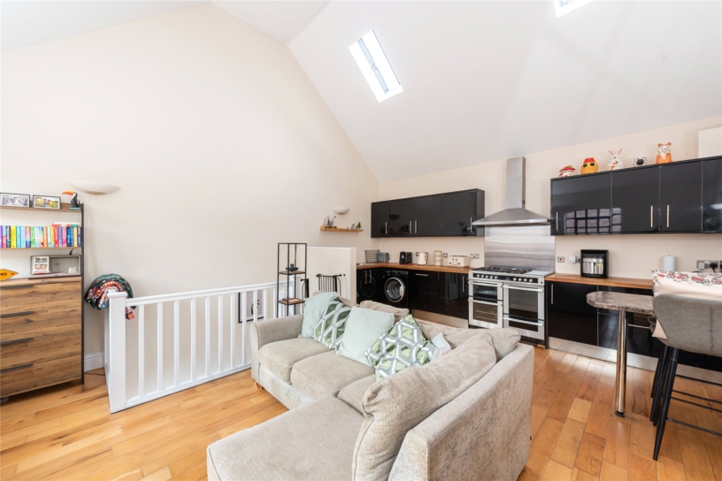 This open plan room has a vaulted ceiling, two windows to the front and two Velux windows to the rear. The kitchen area has a range of high gloss wall and base units with work surfaces incorporating a stainless steel sink and drainer. There is space for a range style cooker with an extractor hood over, a built-in dishwasher, and a built-in breakfast bar for dining. Wood flooring continues into the sitting area.