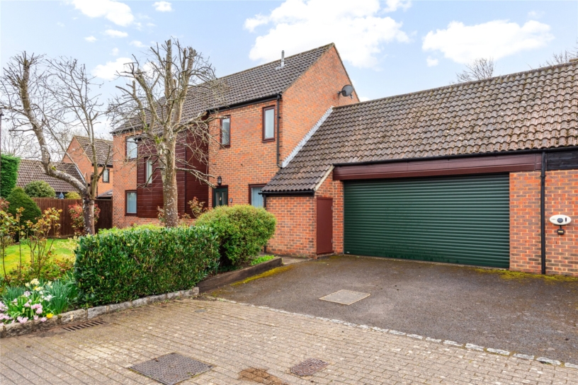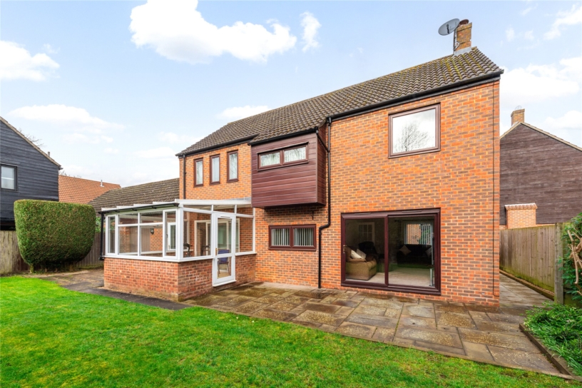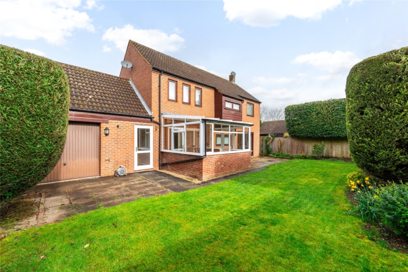 A four bedroom detached house with an en suite shower room, four reception rooms, a double garage and off street parking, situated in a cul-de-sac with woodland views, in Great Linford.