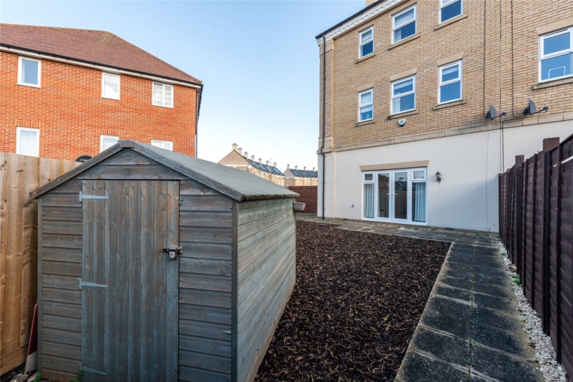 The ground floor accommodation includes an entrance hall with stairs to the first floor, a cloakroom, and a fitted kitchen which is open plan to a dining/family room with double doors to the rear garden. On the first floor there is a sitting room with windows overlooking the green space, and the principal bedroom which has built-in wardrobes, and a modern en suite shower room. On the second floor there are three further bedrooms, one with built-in wardrobes, and a main bathroom which has a panelled bath with central mixer taps and a shower over, a pedestal wash basin, and a concealed cistern WC.