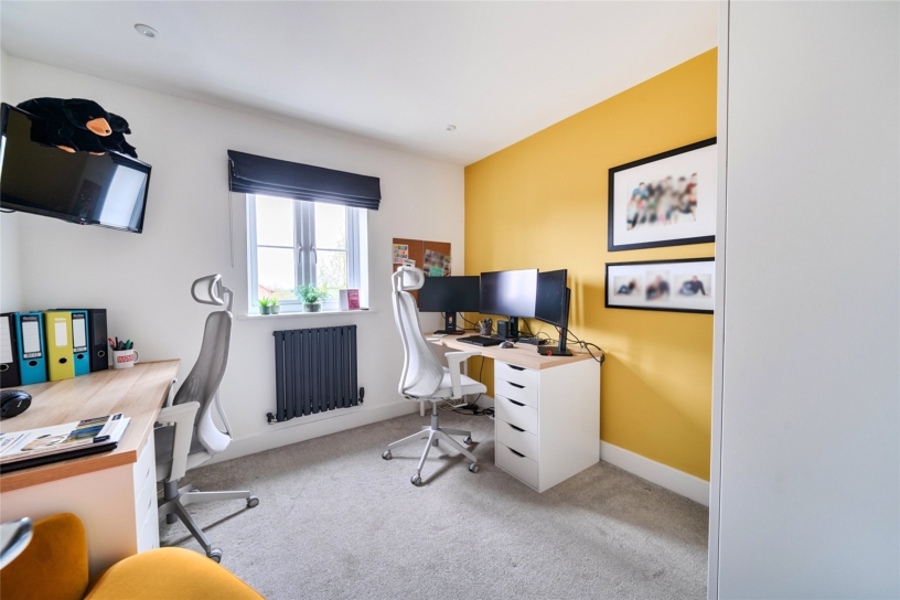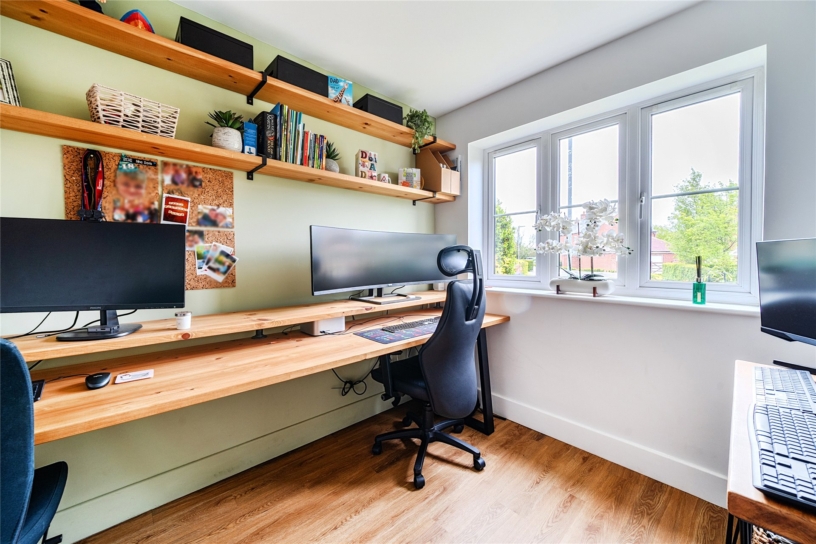 The accommodation includes an entrance hall with stairs to the first floor, a cloakroom, and access to a utility room with spaces for appliances, a dual aspect sitting room with a feature chimney breast with an inset electric style log burner, and a study. Also on the ground floor is a fitted kitchen/breakfast room which opens into a dual aspect family/dining room with bi-fold doors to the patio entertaining area, and access to the boot room which has a door to the rear garden. On the first floor there is a principal bedroom with an en suite wet room and a further double bedroom with an en suite shower room. There are three other bedrooms, one which is currently used as an office. The main bathroom has a four piece suite.