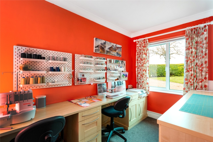 The kitchen has a comprehensive range of units including a larder cupboard, and island with breakfast bar. Quartz work surfaces incorporate a stainless steel sink and a Quooker tap. Integrated appliances include Miele dishwasher, induction hob, microwave, steam/combi oven, main oven and fridge/freezer. The adjoining breakfast area has a glazed door to the garden and space for a table and chairs. The utility room has matching units, with space for a washing machine and tumble dryer.