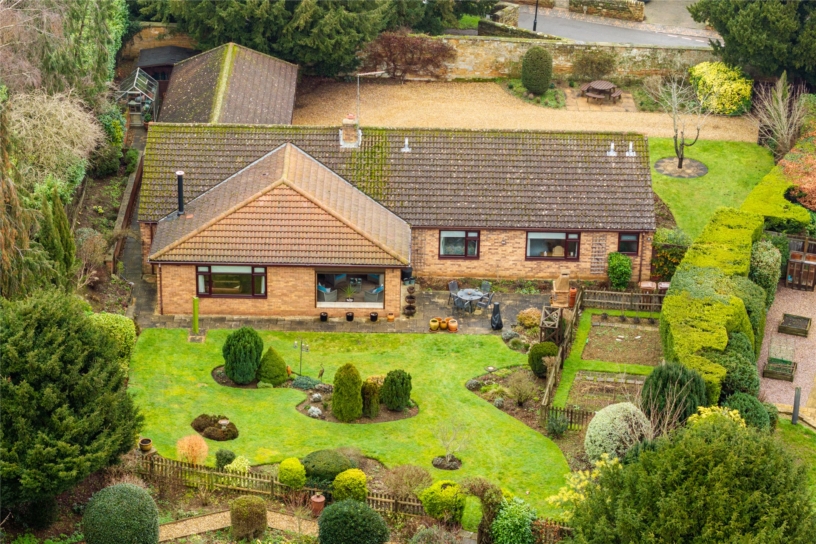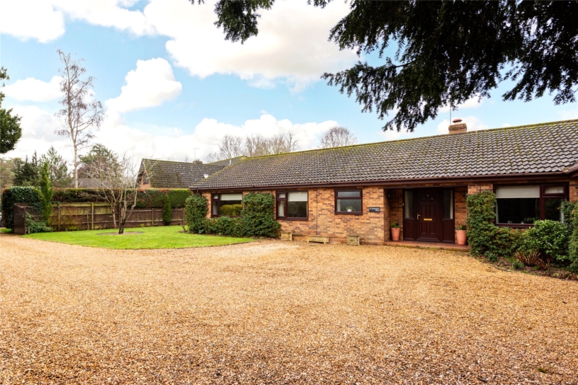 A four bedroom individually designed detached bungalow with front and rear gardens, a double garage and driveway parking, set in approximately 0.5 acres of land.