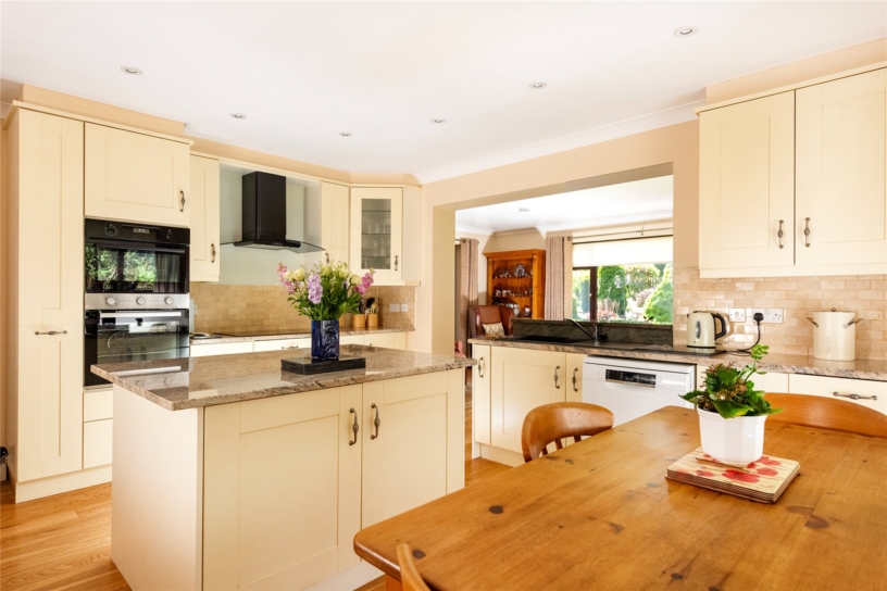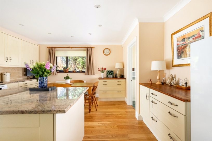 The dual aspect kitchen is fitted with a range of units including pan drawers and concealed bin/recycling, with a combination of granite and timber worksurfaces incorporating a sink and drainer with a mixer tap. A matching central island has extra storage. Integrated appliances include double eye level ovens and an induction hob with an extractor over and there is space for a dishwasher, fridge/freezer and a table and chairs.