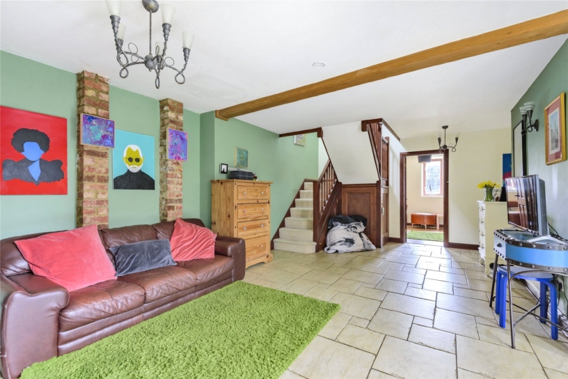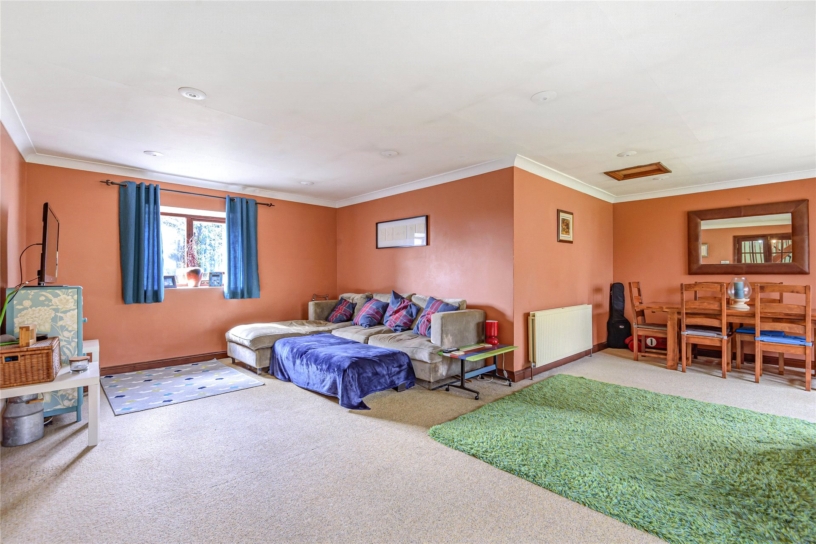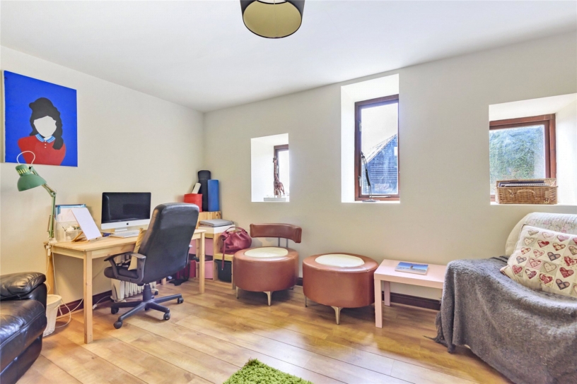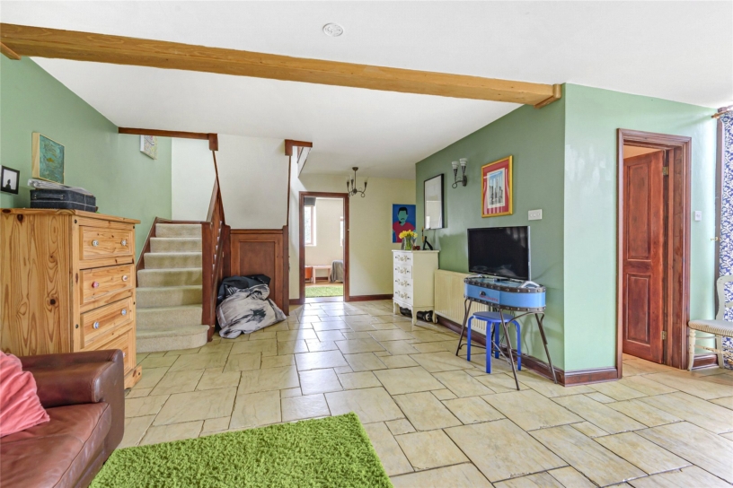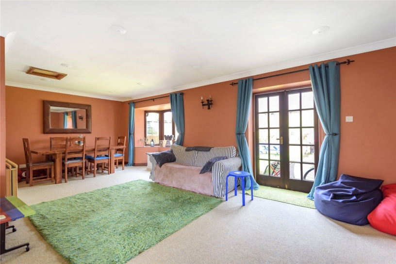 The dining hall is a large central room with tiled floor, understairs cupboard and exposed brickwork. The 'L' shaped sitting room has a dual aspect with French doors opening to the enclosed garden. The family room has an open fireplace with exposed brick chimney breast and wood effect flooring.
