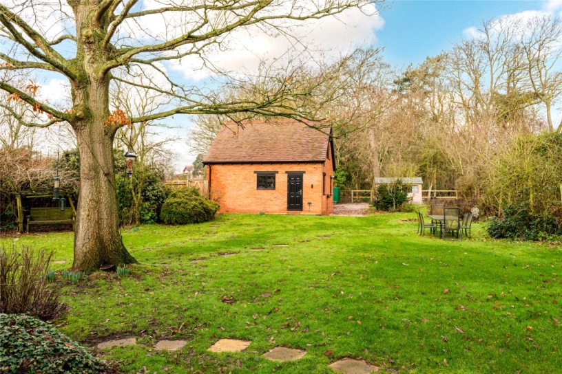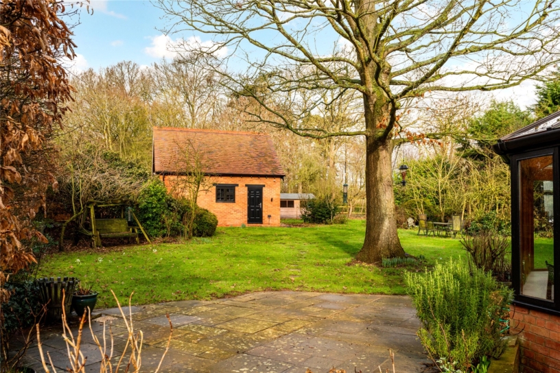 The enclosed rear garden is not overlooked and is laid to lawn with mature trees and established hedgerow. There is a paved patio accessed from the conservatory and stepping stone pathways leading to the garage and the far end of the garden which has a pedestrian gate and double wooden gates to the gravel driveway which provides off street parking for several cars in addition to the double garage.