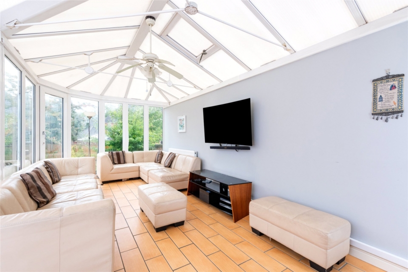 The rear garden is enclosed by close board timber fencing and has a paved terrace stretching across the rear of the house onto which the single and double conservatory doors open. Steps lead down to the lawned area which has a miniature tree and shrub border and a brick-built pond in the far corner. There is gated side access from the front garden and drive.