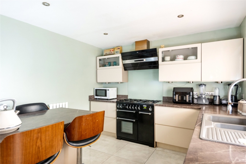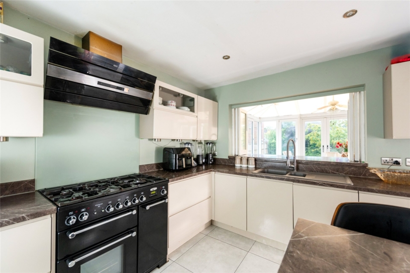 With two separate doors off the entrance hall, the kitchen/breakfast room is fitted with a range of contemporary, handleless base and wall units including pan drawers, with complementary upstands and worksurfaces with a breakfast bar and a one-and-a-half bowl sink and drainer with a mixer hose tap. There is space for an American style fridge/freezer, a washing machine, and a rangemaster oven which has an extractor over. A partially glazed door and bi-fold windows open to the conservatory.