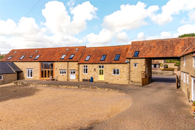 Former barns across the courtyard from the main farmhouse have been converted into additional accommodation with four bedrooms and four bath or shower rooms. A former double height opening has been glazed with double height windows and glazed double doors which open into a spacious hallway with a cloakroom, stairs to the first floor, and a walk-in cupboard which is currently used for coats and shoes.