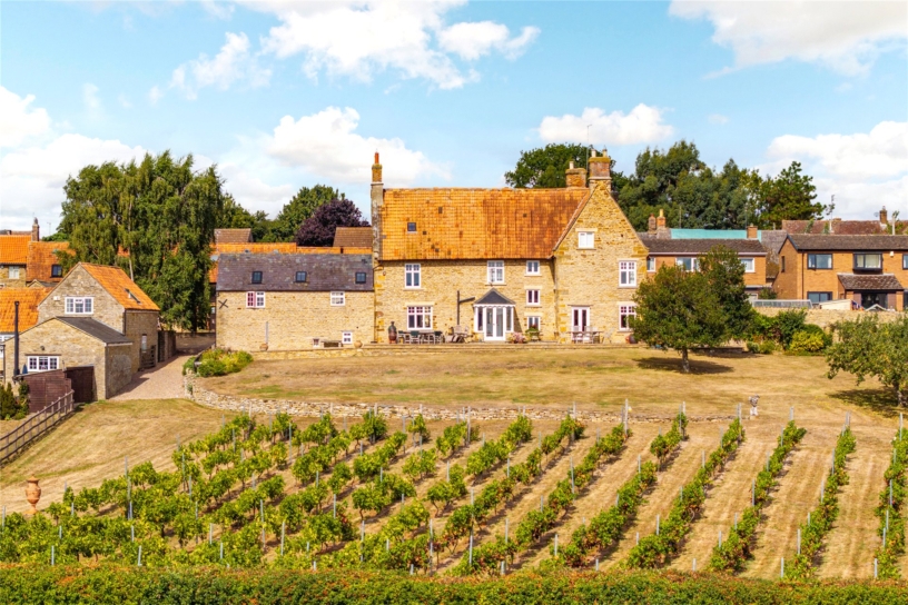 The main front door has decorative stained glass inserts and opens into a reception hall which has a stone paved floor, a window overlooking the courtyard, an exposed ceiling beam and stairs up the first floor and down to the wine cellar. A part glazed door with a stained glass fanlight leads to a rear lobby which has triple aspect windows and double doors to a paved terrace in the garden which has panoramic far reaching views over the garden, vineyard, and the Nene valley.