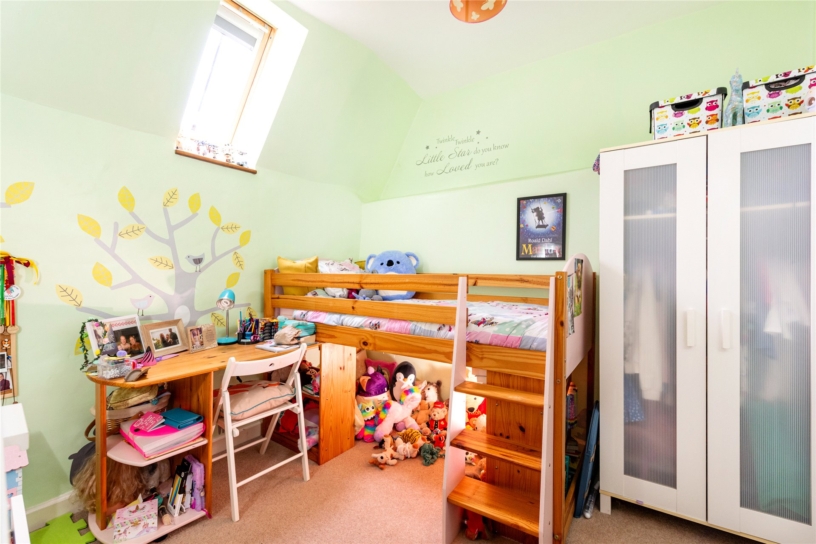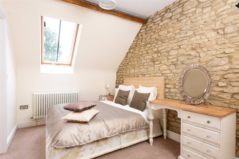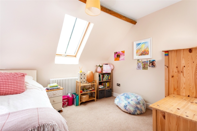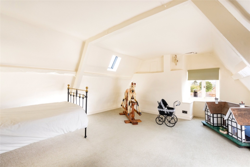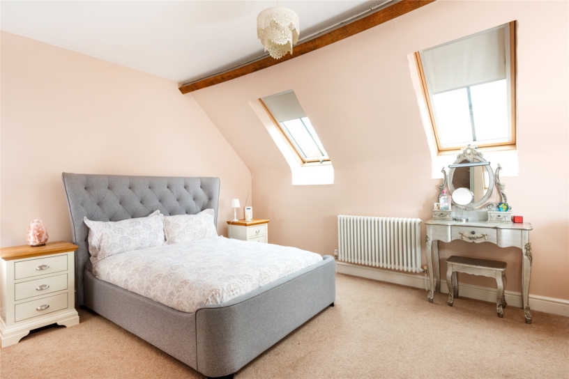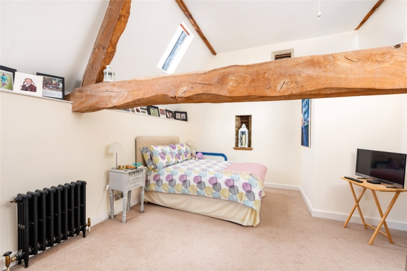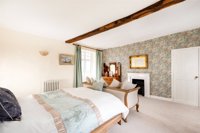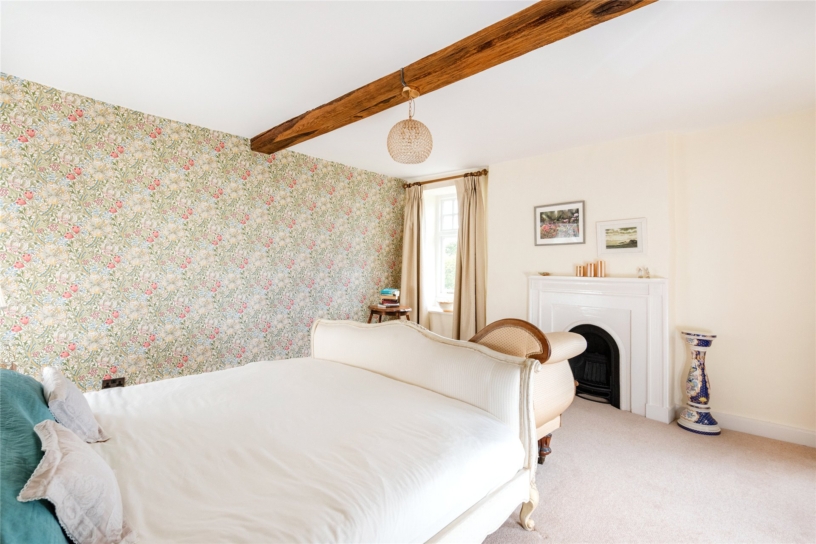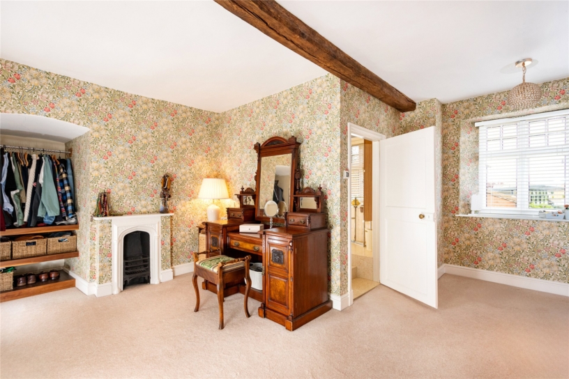The principal bedroom has a feature fireplace, an exposed ceiling beam and dual aspect windows with far reaching countryside views. There is an opening to a dressing room which also has a feature fireplace and an exposed ceiling beam. There are dual aspect windows, space for a dressing table, and a range of built-in Walnut open fronted wardrobes with hanging space and shelving. An alcove has an additional hanging rail and shelved storage. The dressing room has a door to a fully tiled en suite shower room which has a double shower cubicle with a rainwater shower head, a WC, and a vanity washbasin. The dressing room has a door to the landing and could alternatively be used as an additional bedroom if preferred.