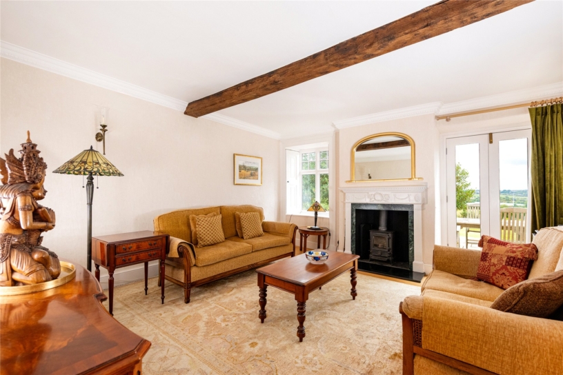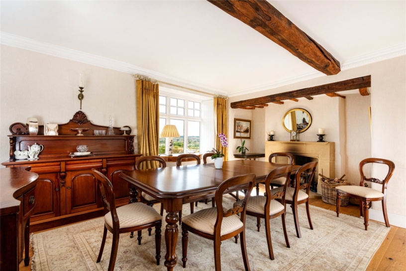 The sitting room has an exposed ceiling beam and ornate coving, wood flooring, and a feature fireplace with a carved surround and an inset log burning stove. There are dual aspect windows and glazed double doors to the terrace in the rear garden for al fresco dining and entertaining. The dining room also has wood flooring, and has dual aspect windows, with shutters, to the courtyard and to the rear with views over the surrounding countryside. There is an inglenook fireplace with a timber bressummer and a working open fire.