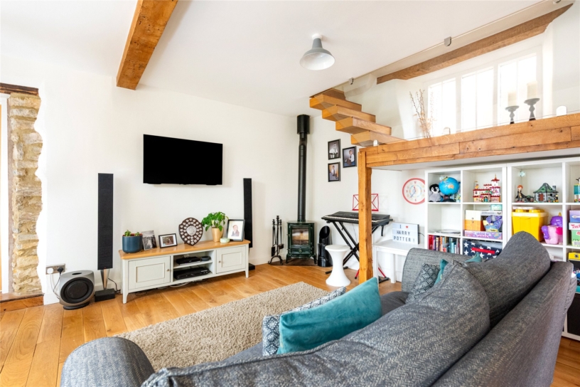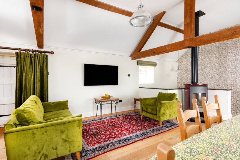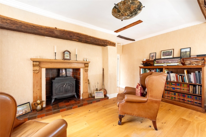 The kitchen leads to the dual aspect third reception room which is currently used as an office for working from home. It has wood flooring, a connecting door to the farmhouse, and a window with a window seat overlooking the courtyard. There are exposed ceiling beams and a feature fireplace, with a wooden mantel and surround, housing a log burning stove.