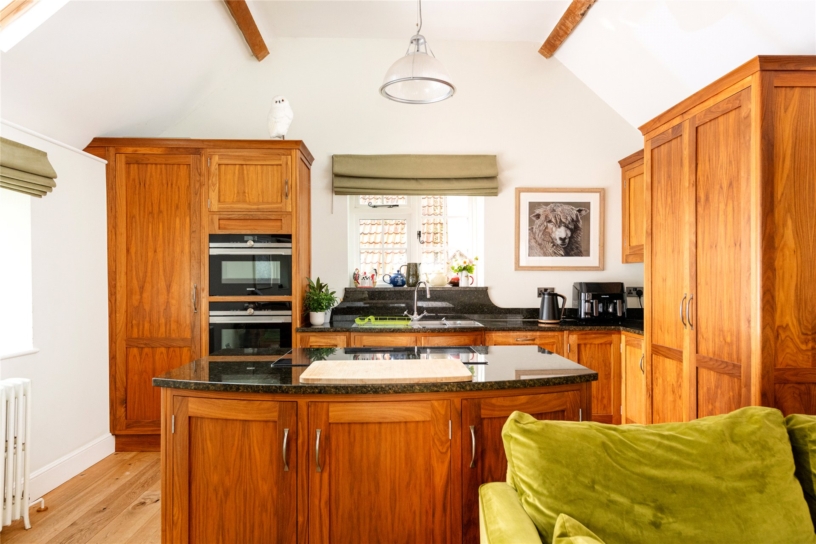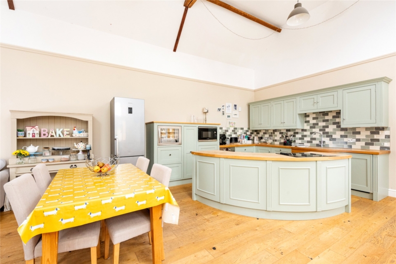 This measures just under 30 ft. long and has plenty of natural light with windows and a part glazed door to the courtyard as well as three Velux skylights in the vaulted ceiling. The kitchen has a range of two tone base and wall units, including pan drawers and a pull out larder unit, and a curved island which provides additional storage and incorporates a Bosch electric hob. Other Bosch appliances include a microwave, an oven, a wine fridge, and a dishwasher. The wooden worksurfaces incorporate a sink with a mixer tap and there are complementary metro tiled splash areas. There is space for a fridge/freezer, a dresser unit, a dining table and chairs and a soft seating area.