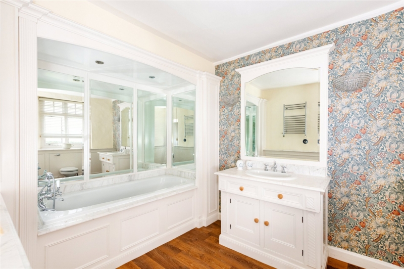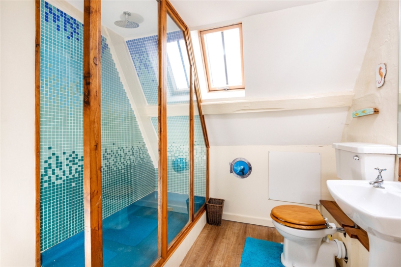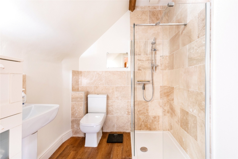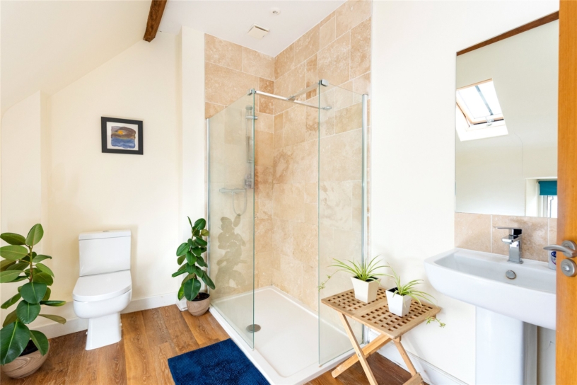 The principal bedroom has dual aspect windows, a dressing room with a range of built-in storage with hanging rails and shelving, and a three piece en suite shower room. Bedroom two has two Velux windows overlooking the courtyard and a feature exposed beam. The third bedroom has a Velux window to the rear. These bedrooms share a four piece bathroom which has a freestanding claw footed bath, a walk-in shower cubicle, a WC and a washbasin.