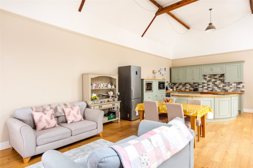 A door leads to a further room which is currently just used as a multi-purpose studio, with light and heating. It has, natural light from glazed doors to the courtyard and could alternatively be used as an additional reception room such as a gym or games room if required. On the other side of the hall there is a sitting room which has windows overlooking the courtyard and wooden flooring which continues into the open plan kitchen/dining room.