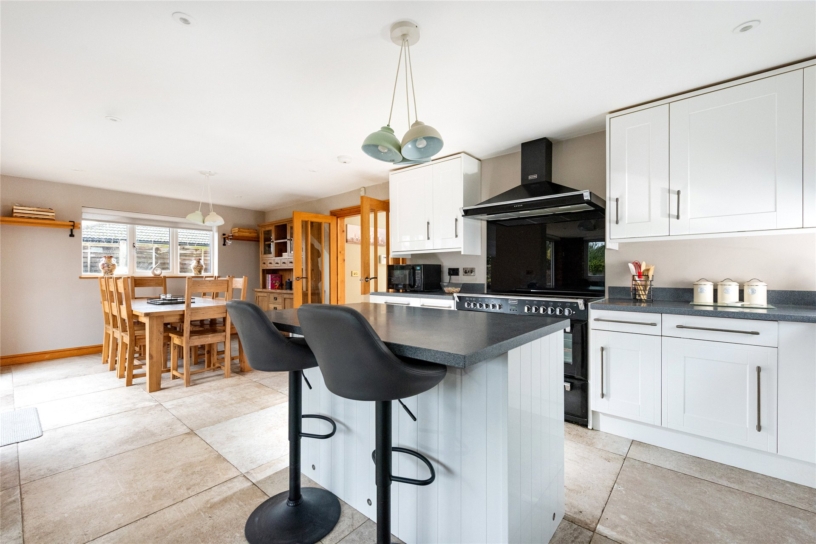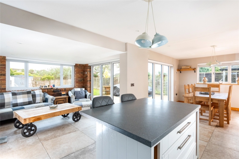 The kitchen is fitted with a range of units with Corian upstands and worksurfaces incorporating a one and a half bowl sink and drainer with a hose mixer tap. The matching island has additional storage and a breakfast bar. Integrated appliances include a dishwasher and a Stoves range cooker with three ovens, a plate warmer and a seven ring hob with an extractor over. There is space for an American style fridge/freezer. Tiled flooring continues into the triple aspect sun room and the dining area which both have bi-fold doors to a patio in the garden giving an excellent flow through internal and external space for modern life and entertaining.