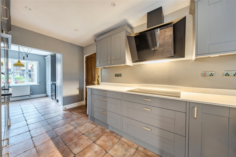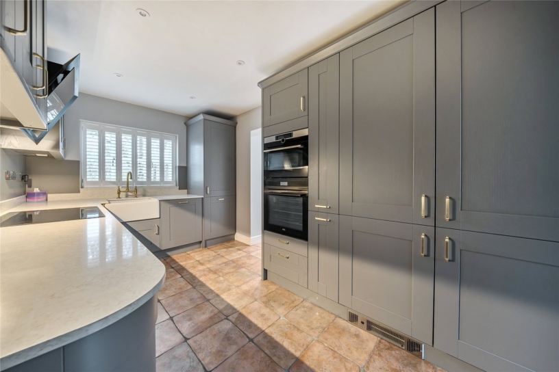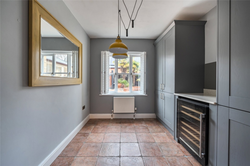 The kitchen area is fitted with a range of Shaker style units including a full height pull-out larder cupboard and pan drawers with complementary upstands and worksurfaces incorporating a Belfast sink with a mixer tap. Integrated appliances include a dishwasher, a full height fridge/freezer, an eye level oven and combination microwave oven, and an induction hob with an extractor over. The breakfast area, overlooking the garden, is fitted with matching units and has space for a wine fridge and room for a table and chairs.