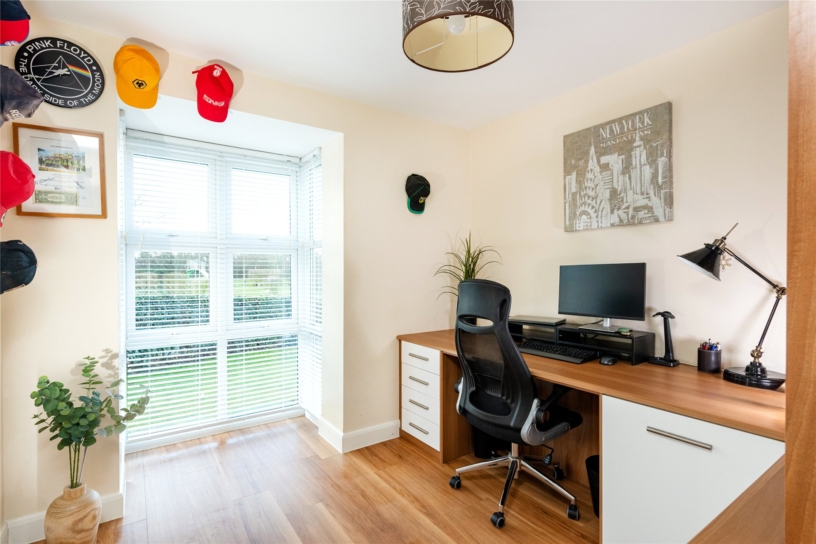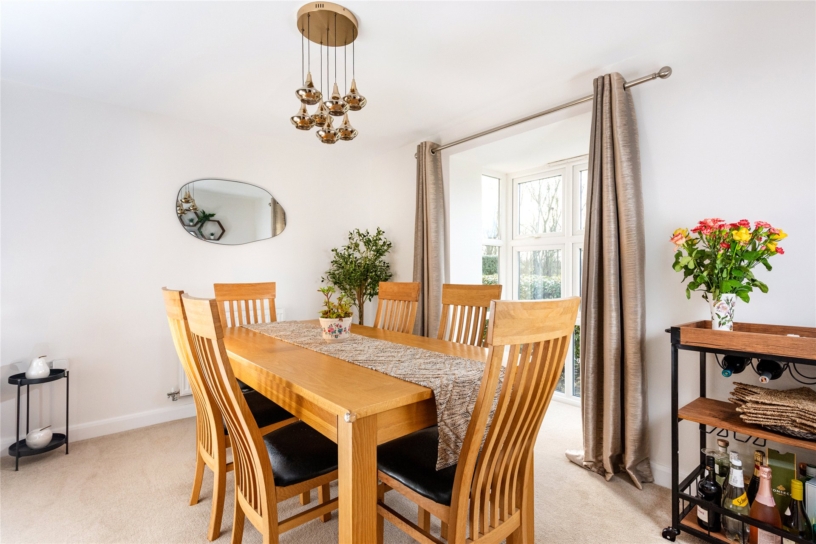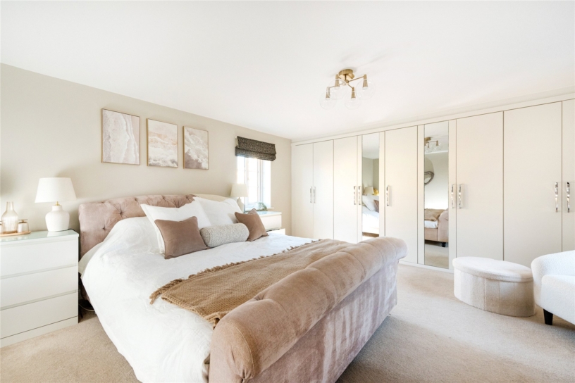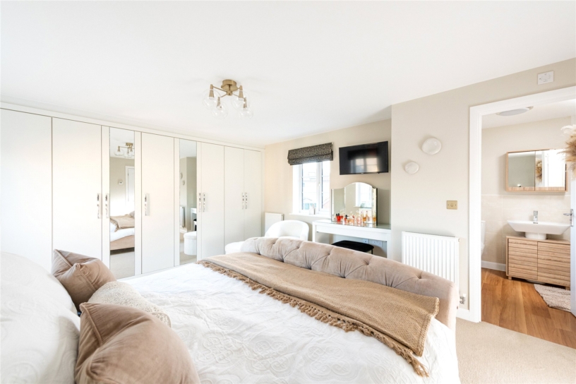 The property is situated on the edge of the estate and is a few minutes' walk from the Grand Union Canal. There is over 2,430 sq. ft. of accommodation set over three floors which includes an entrance hall with a cloakroom, cloak cupboard, stairs to the first floor and access to the study and dining rooms which both have box bay windows to the front. The triple aspect sitting room has a feature fireplace, box bay window to the side and French doors to the rear patio and garden. Also on the ground floor is the kitchen/breakfast room and adjoining utility room. On the first floor is the principal bedroom has fitted wardrobes and an en suite shower room. There are three further double bedrooms, a four piece family bathroom and a storage cupboard. There are three additional bedrooms on the second floor, one of which is a guest suite with built-in wardrobes and an en suite bathroom.