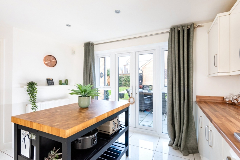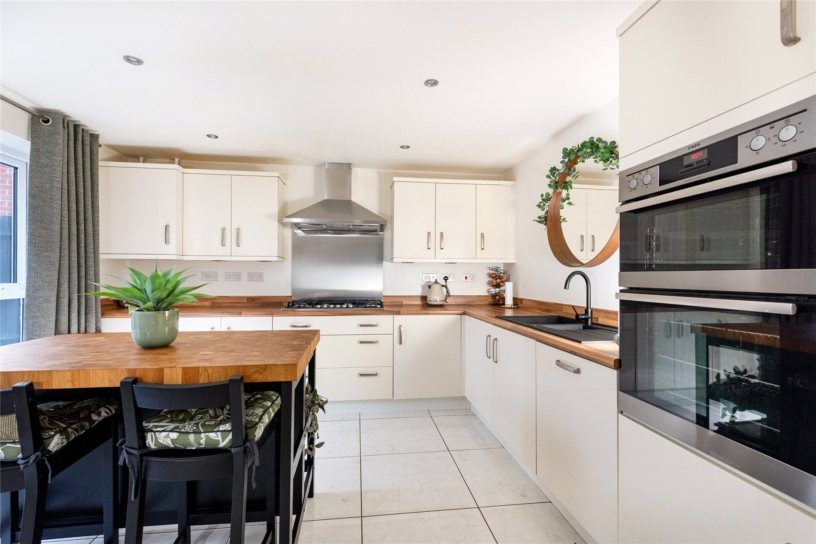 The kitchen has French doors, with wing windows, to a patio in the rear garden. It is fitted with a range of contemporary units with oak upstands and worksurfaces incorporating a one and a half bowl sink and drainer with a mixer tap. Integrated appliances include a dishwasher, a fridge/freezer, an eye level oven and grill, and a six ring gas hob with an extractor over. A freestanding island provides additional storage and a breakfast bar. There is a door to the adjoining utility room which has additional storage, a sink, space and plumbing for appliances, and a door to the rear garden.