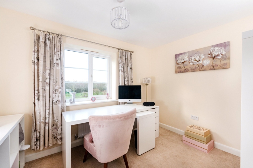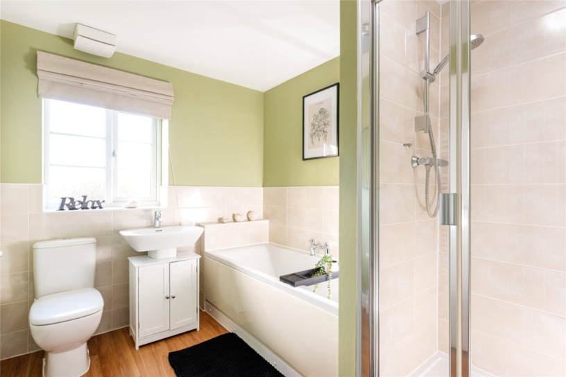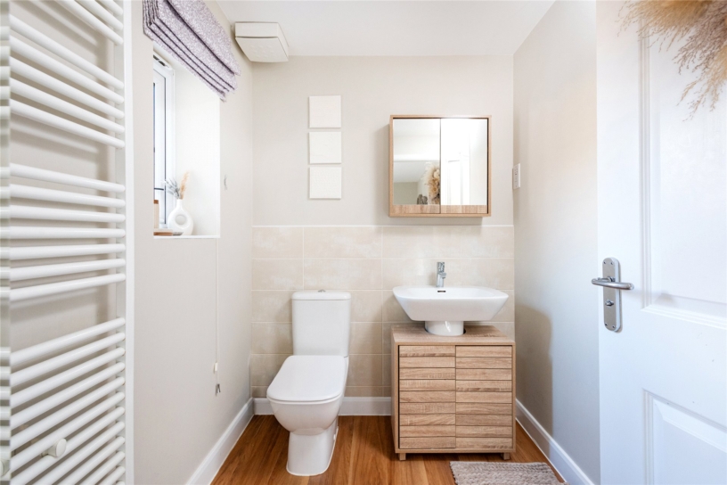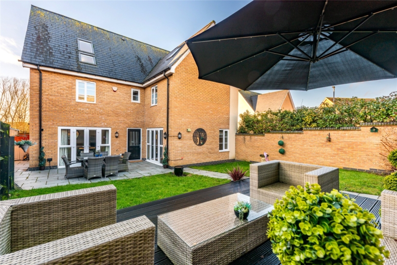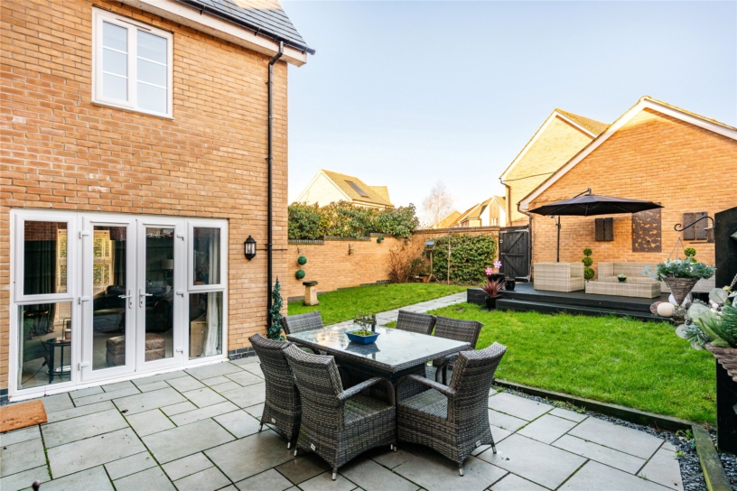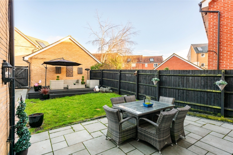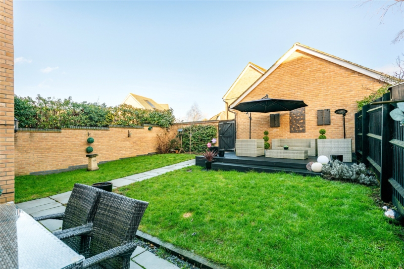 The front of the property is enclosed by low level hedging and is laid to lawn with a path to the front door and views over the play area. The rear garden is enclosed by a combination of brick walls and close board fencing. There is an extensive patio outside the kitchen and sitting room doors which continues round one side of the house, and a paved path leads to a raised decked area which provides additional space for tables and chairs for al fresco entertaining. There is gated access to the driveway and garage, outside lighting, power connected and a tap. The remainder of the garden is laid to lawn.