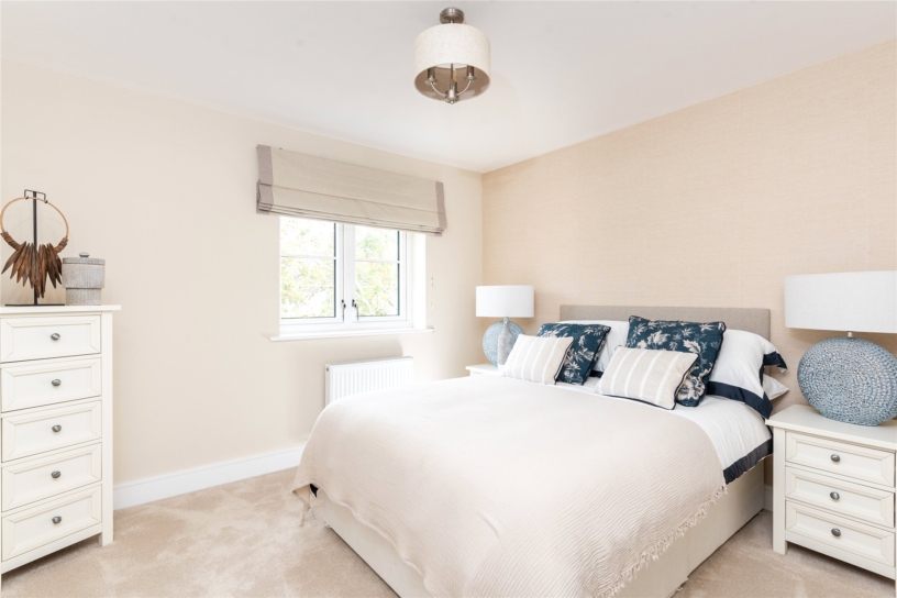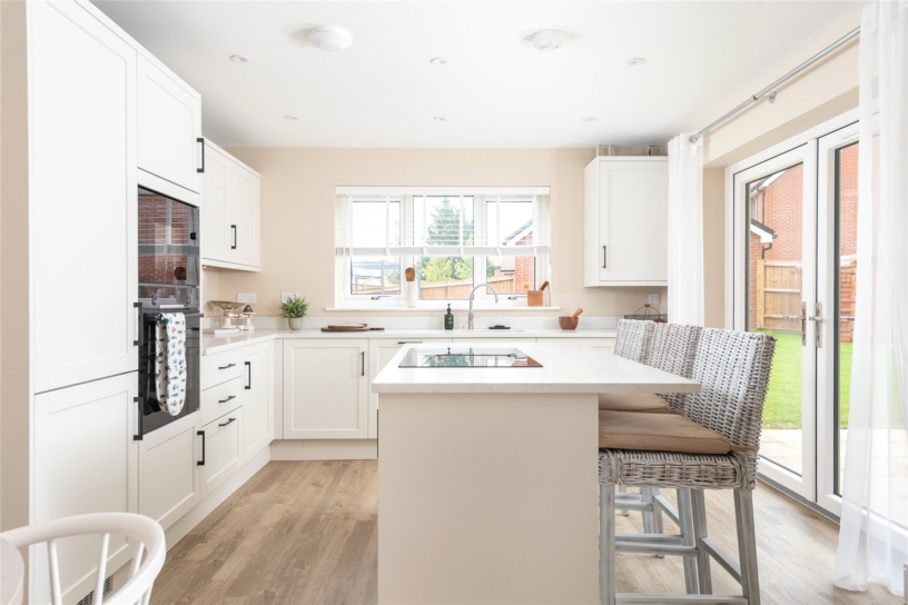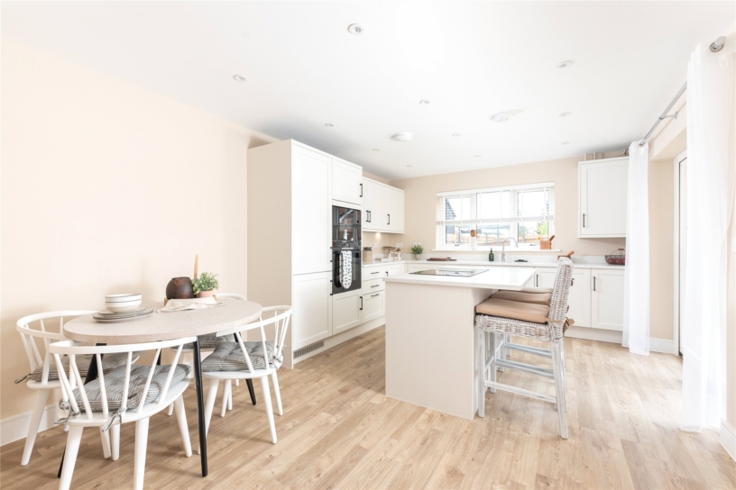 The kitchen/breakfast room is over 19 ft. long with modern base and wall units with quartz worksurfaces incorporating a one-and-a-half sink unit. The central island has a breakfast bar seating three and an inset induction hob. Other integrated appliances include eye-level double ovens and a dishwasher. Amtico wood effect flooring extends from the kitchen to the entrance hall and cloakroom. French doors open to the stone patio and garden. Please note the photos show the development’s show home, which is a different house type and should only be used as a guide to the specification and finish.