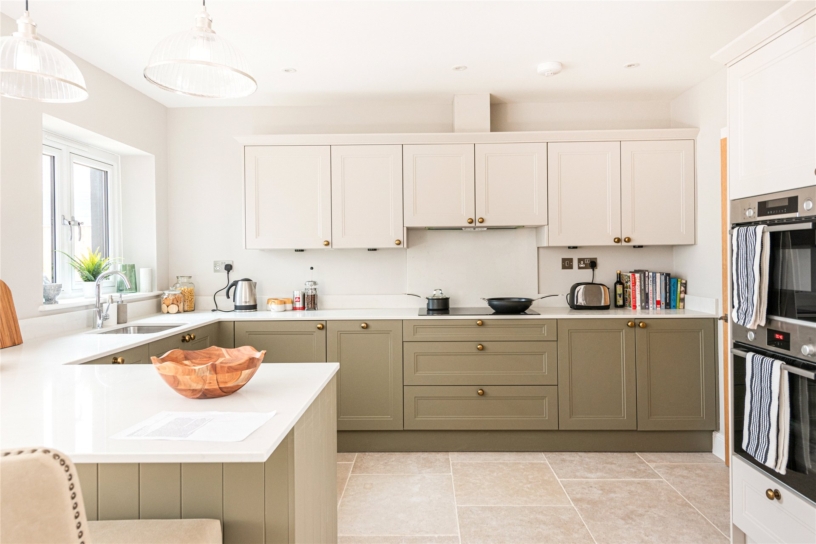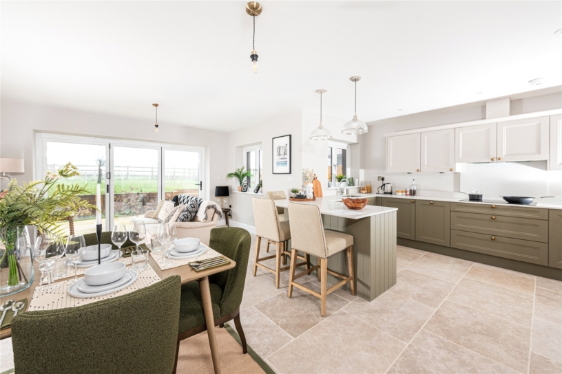 The L-shaped open plan room overlooks the garden and side and has bi-folding doors to the patio. It has limestone floor tiles and a range of Shaker style base and wall units. Quartz worksurfaces have matching upstands, and an inset stainless steel sink. Integrated appliances include an oven, a combi second oven and microwave, a fridge/freezer, and a dishwasher. There is space for a dining table and a seating area. Accessed from the kitchen, the utility/boot room has the same flooring and fitted cabinets and space for a washing machine and tumble dryer. An external door accesses the side path.