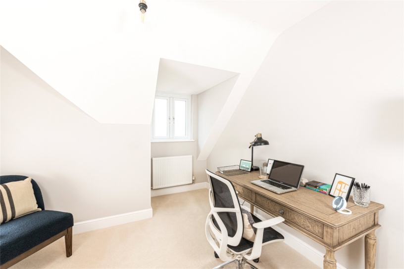 Pearmain Cottage is the last remaining plot in a development of four properties. Built to a high specification and EPC rated B, it has an air source heat pump with underfloor heating, a fully equipped kitchen and Mandarin Stone tiled bathrooms. Built in a traditional style, in keeping with period properties in this Chiltern Hill village, the front door of the cottage is sheltered by a tiled canopy with overarching beams and opens into a hallway which has doors to a two piece cloakroom, an understairs cupboard, and an over 13 ft. square sitting room with an inset woodburning stove. The triple aspect open plan kitchen/dining/family room has bi-fold doors to the rear garden which overlooks a tree-bordered paddock. Stairs with painted wooden balusters rise to the first floor landing, from which lead the three bedrooms. The principal bedroom has a dressing area and an en suite shower room, while the other two bedrooms share a Jack and Jill three piece family bathroom.