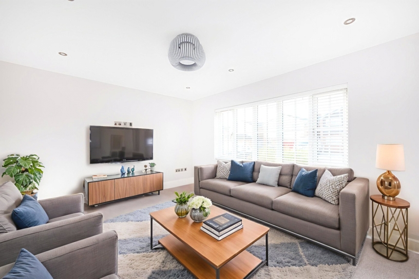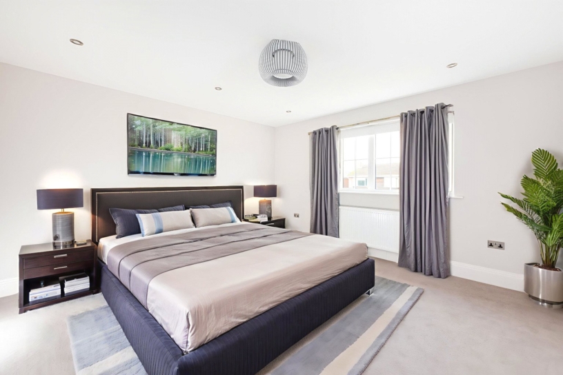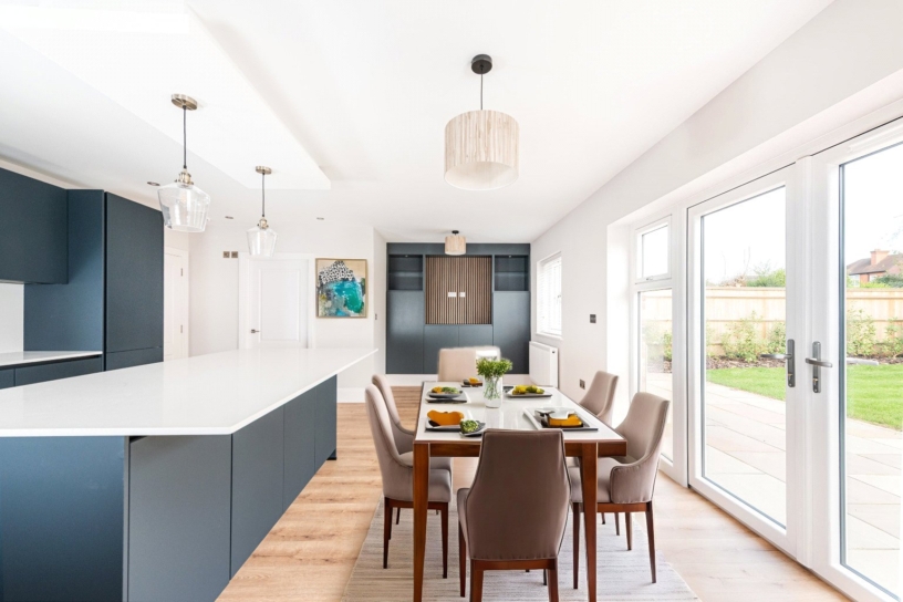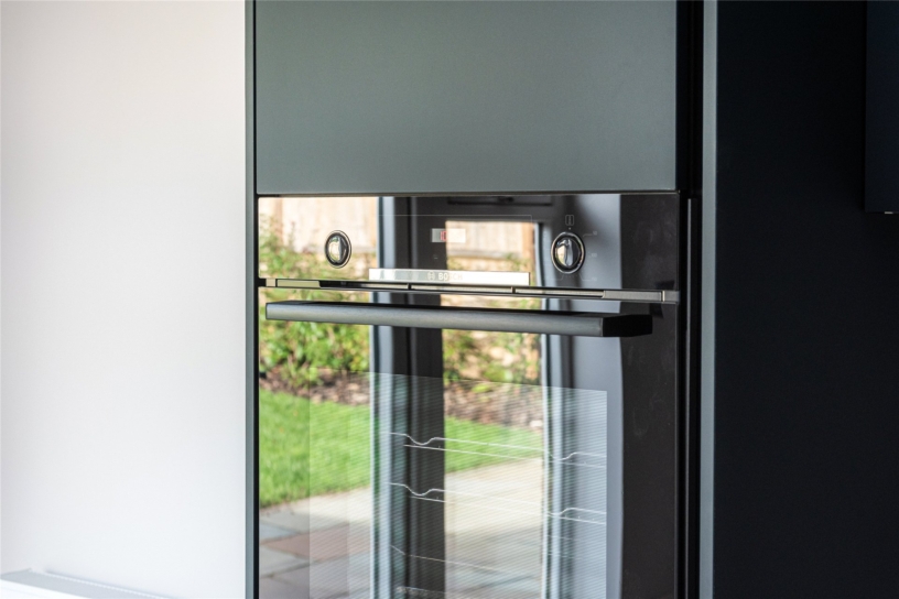 The kitchen is equipped with a range of German manufactured handleless base and wall units, with a low profile Quartz worktop with an undermount stainless steel sink. Integrated appliances include: a Bosch dishwasher, an eye-level oven, a four ring induction hob, and a Hotpoint fridge/freezer. The island with a matching worktop, provides extra storage and breakfast space for several bar stools. The family area has a bespoke media unit with decorative panels; there is space for a dining table. The utility room has wall and base units, an undermount sink and space for a washing machine and a tumble dryer.