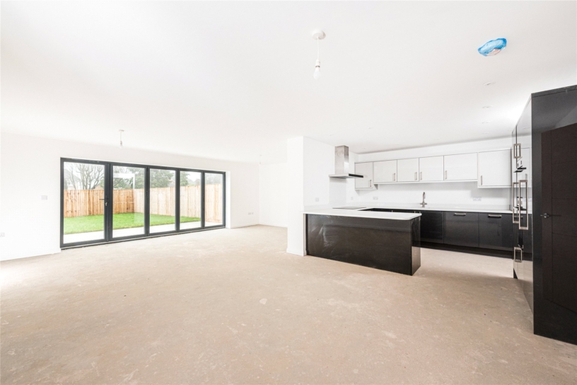 The contemporary fitted kitchen area has gloss base units with contrasting wall units, Quartz work tops and upstands, and an inset stainless steel sink. Integrated appliances include a Neff induction hob with an extractor above, a Neff double oven, a dishwasher, a full-height fridge, and a freezer. With uniform flooring continuing from the kitchen area, the dining/family area has bi-folding doors and ample room for a dining table and relaxed seating. The utility room leads off the kitchen and has matching units and worksurfaces, a sink and space and plumbing for a washing machine and tumble dryer.