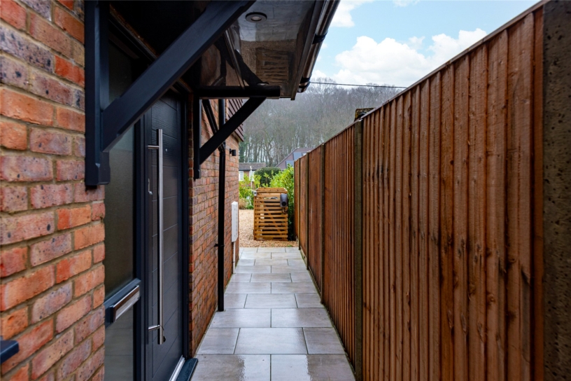 Gated side access from the drive leads to an enclosed south westerly facing garden which is mainly laid to lawn and enclosed by wood panel fencing. The porcelain patio spans the entire width of the plot adjacent to the rear of the house. At the front is a gravel driveway with parking space for multiple vehicles and an EV charge point. The front and side have been planted with laurel hedging.