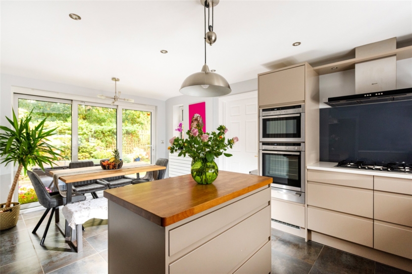 The kitchen/breakfast area has a range of modern high gloss wall and base units with quartz work surfaces incorporating a one and a half bowl sink and drainer, and a breakfast bar. The central island has a wooden work surface and pan drawers. Built-in appliances include an eye level double oven, a gas hob with an extractor over, a dishwasher, a fridge, a freezer, a wine cooler, and a plate warmer. Tiled flooring continues to the dining area which has sliding patio doors to the garden.