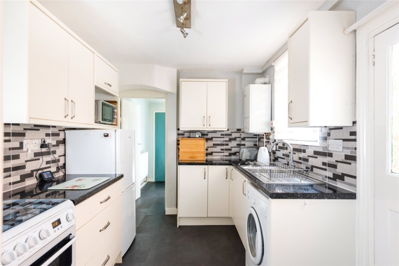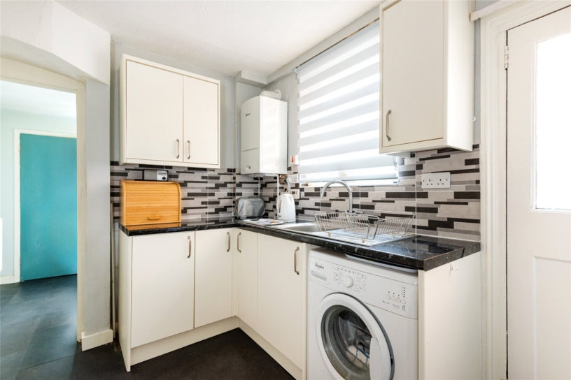 The kitchen has a range of wall and base units with work surfaces incorporating a stainless steel sink and drainer with a mixer tap over. There are spaces for a cooker, a washing machine and a fridge/freezer, a wall mounted boiler, a pantry in the understairs storage cupboard, and a door to the rear lobby.