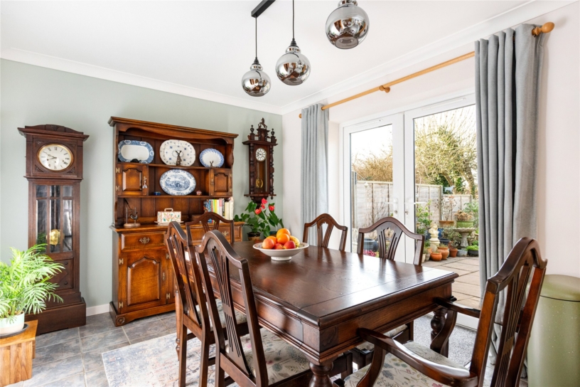 The kitchen has a range of modern full height, wall and base units with work surfaces incorporating a stainless steel double bowl sink and drainer. Built-in appliances include an eye level double oven, a ceramic hob with an extractor fan over, and there is space for an American style fridge/freezer. Tiled flooring continues into the dining room which has double doors to a paved terrace seating area in the garden.