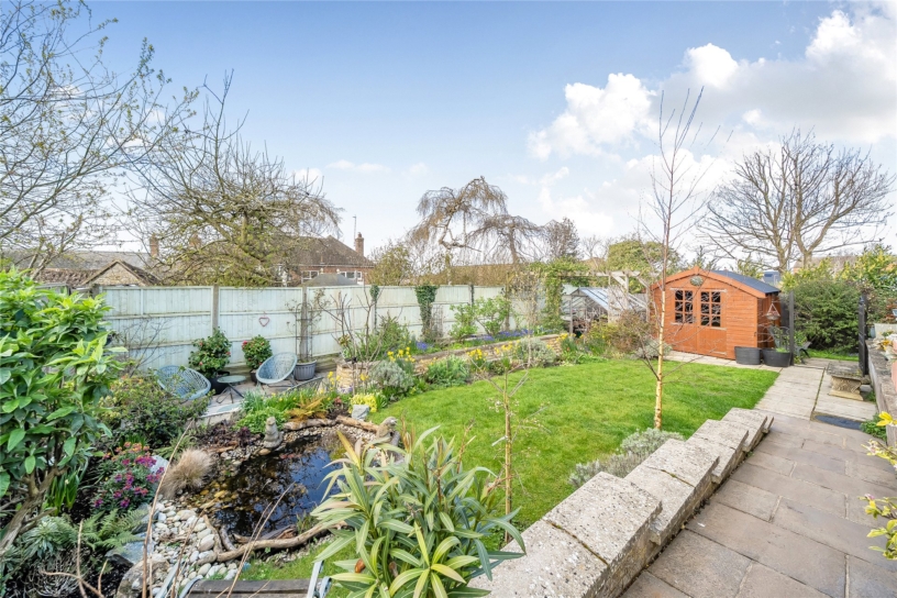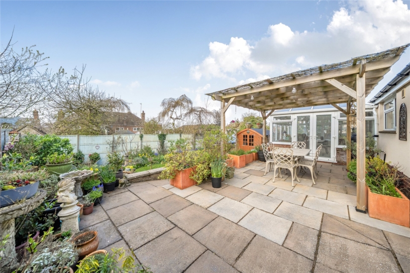 A driveway at the front provides off street parking for four cars leading to the 18 ft x 12 ft 8 garage which has a roller door, and doors to the front and the utility/shower room. The front garden has under lawn mesh to support extra parking if required. Gated side access leads to the enclosed rear garden with a raised terrace area part shaded by a timber pergola, a retaining wall with a paved slope to a lawn garden with an ornamental pond. There are paved pathways, a fully insulated garden cabin, and several storage sheds located in the side garden. A paved patio at the bottom of the garden has raised stone walled bed, and a greenhouse.