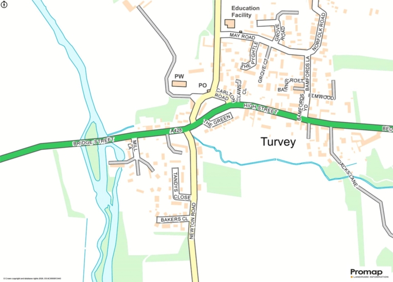 Turvey is a village and civil parish on the River Great Ouse in Bedfordshire, approximately 6 miles west of Bedford. The village is on the A428 road between Bedford and Northampton, on the border with Buckinghamshire. There are two shops, a butchers', two public houses and a primary school, playing fields for cricket and football, and two tennis courts. Turvey is within the school catchment for Sharnbrook Upper school or has a bus to the Bedford Harpur Trust schools which are about 7 miles away.