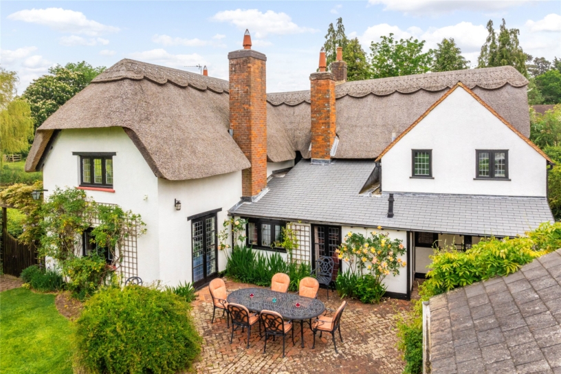 The timber front door opens to a thatched porch with side windows and floor tiles, which continue into the kitchen area. Ahead, stairs rise to the first floor landing. Doors on each side open to a dining room on the right and the kitchen area on the left. The kitchen/breakfast room has a door leading to the utility room, which in turn accesses the larder, the cloakroom and the rear terrace. Doors from the breakfast area also access the snug, which has French doors opening to the rear terrace and double doors to the sitting room. The sitting room also accesses the terrace.