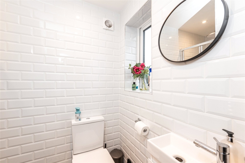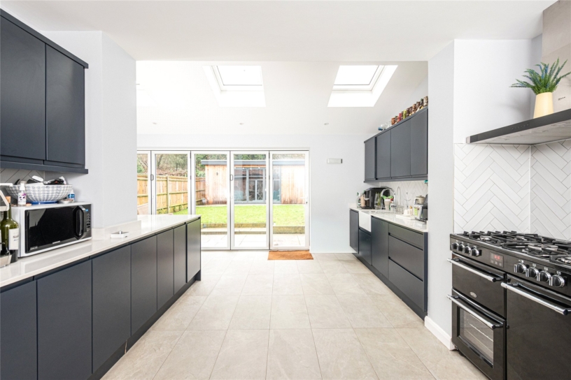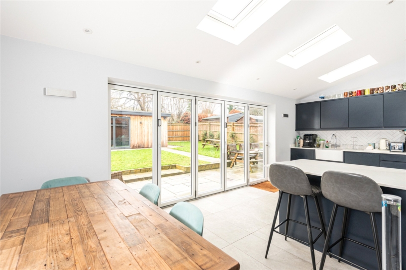 The kitchen/dining/family room was enlarged by a single storey rear extension which has Velux skylights and bi-fold doors to a patio in the garden providing plenty of natural light and a good flow from the internal to external space for modern family life and entertaining. The kitchen has a comprehensive range of wall and base units with white granite worktops incorporating a breakfast bar and an inset butler sink. Integrated appliances include a Belling stove with a gas hob and electric ovens, a dishwasher, a fridge, and a freezer. An inbuilt cupboard provides space for a vented tumble dryer and washing machine.