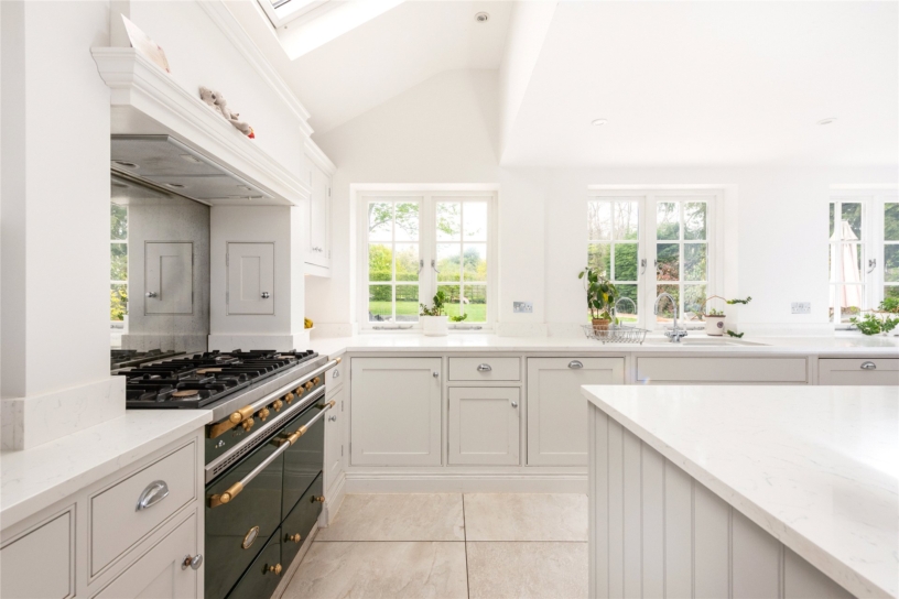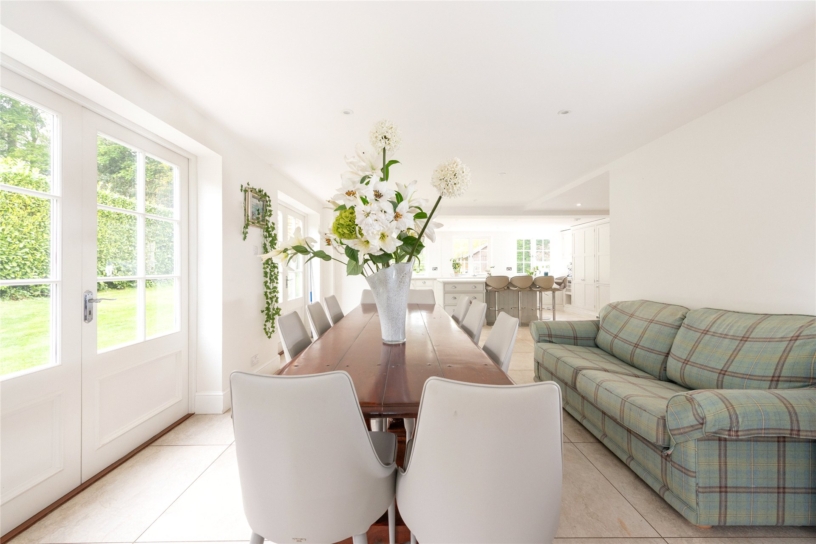 The kitchen is fitted with a range of bespoke units with marble worktops by a local architectural joinery company and has integrated appliances by Miele, Siemens, and Bosch. There is also a large central breakfast and storage island. Beneath a moulded mantel with an extractor above is a Lacanche Range oven with a mirrored splashback. There are USB sockets and recessed LED lighting. The room, with porcelain flooring throughout, is open plan to the dining/family area with French doors to the garden.