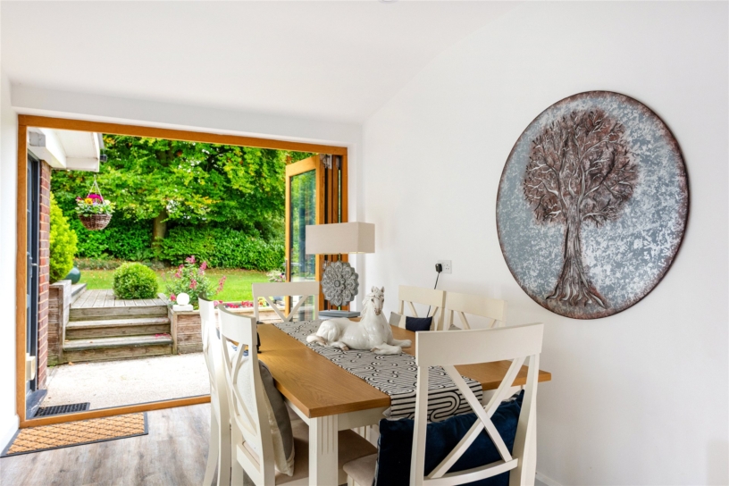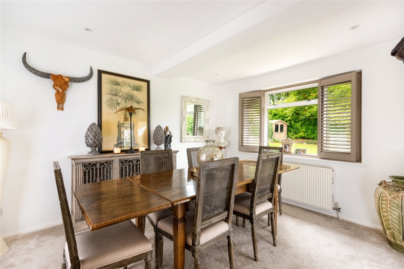 The property is in an elevated position with meadow views to the side. It has been improved by the current owners in recent years with a refitted kitchen and bathrooms, LVT flooring and plantation shutters. A storm porch shelters the hardwood front door which opens to an entrance hall with stairs to the first floor and a cloakroom with a WC and a wash basin. The sitting room has a sandstone fireplace with an inset woodburning stove and is dual aspect including French doors to the garden. A further set of glazed doors open to the family room which overlooks the front and has a door to the annexe accommodation. The dining room has a window overlooking the rear garden and double doors to the sitting room and kitchen/breakfast room. Upstairs there are four bedrooms and a family bathroom. The dual aspect principal bedroom is approached via a dressing area and has an en suite four piece bathroom, a walk-in wardrobe, and in-built wardrobe.